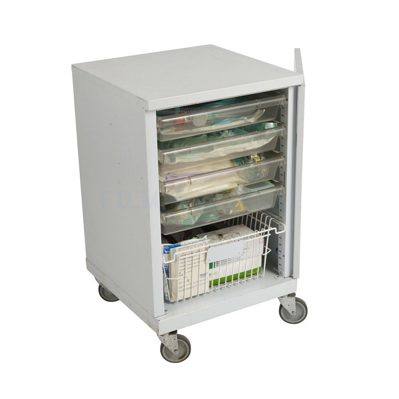 Grey Storage Cabinet for hire. Film Medical have a large selection of Tables Trolleys and Carts props for hire. We have tables trolleys and carts props available which might not be shown on our online prop listing. Please contact us for more details of our stock.