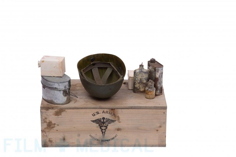 Variety of military props to choose from including helmets, medical equipment and cases, stretchers, gas masks, dressings, bottles, tins, beds etc.